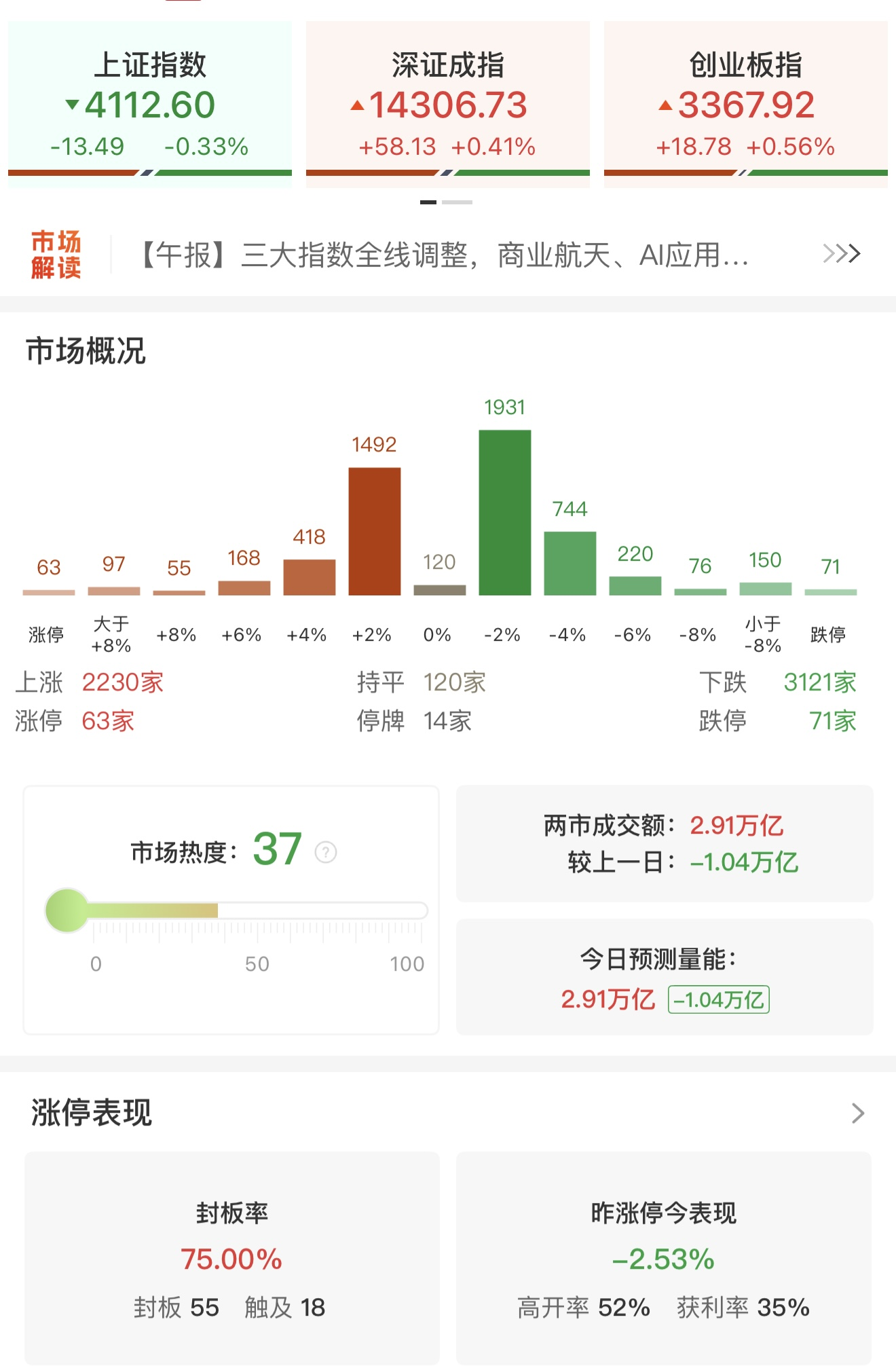 财联社1月15日电 三大指数涨跌不一,沪指盘中一度跌破4100点,创业板指午后探底回升。沪深两市成交额2.91万亿,较上一个交易日缩量1.04万亿。盘面上,市场热点较为杂乱,全市场超3100只个股下跌。从板块来看,半导体板块午后走强,矽电股份20CM涨停创历史新高,彤程新材、康强电子、中旗新材涨停。CPO概念震荡拉升,环旭电子涨停。旅游酒店板块表现活跃,陕西旅游、众信旅游、大连圣亚涨停。有色金属板块走高,四川黄金、罗平锌电涨停。下跌方面,AI应用、商业航天等板块跌幅居前。高位人气股集体退潮配资乐,华人健康、浙文互联、中国卫通、金风科技、鲁信创投等多股跌停。截至收盘,沪指跌0.33%,深成指涨0.41%,创业板指涨0.56%。