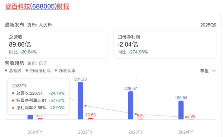 在2022年营收突破300亿元,盈利突破13亿元后,容百科技遭遇了严重的业绩下滑。到2024年,总营收已经跌到了150.88亿元,仅为2022年的一半左右;归母净利润也下滑到了2.96亿元,仅为2022年的21.88%。